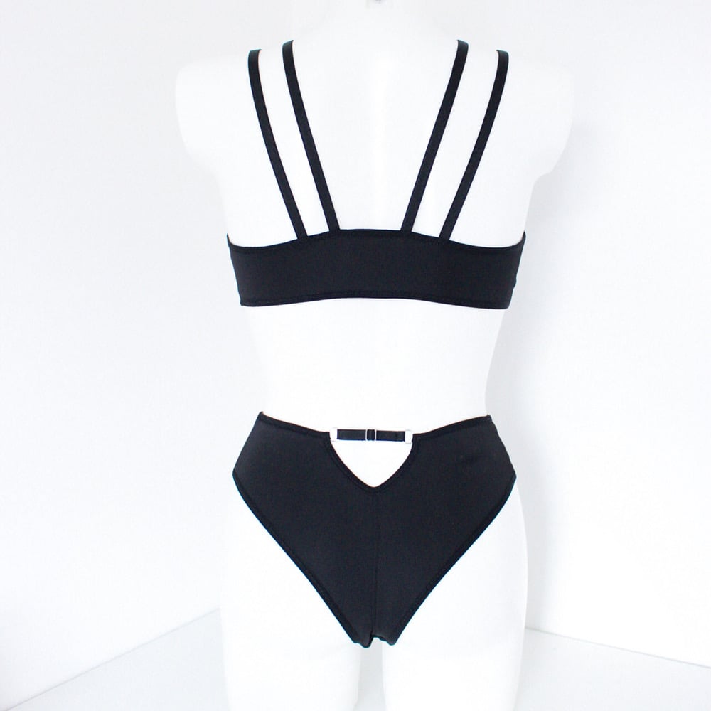 For the first week, we have a gorgeous black scuba cami with a triangle harness overlay, made from a black mesh with silver foil, and a mid rise tanga with the same triangle overlay and a keyhole cutout at the back. Both are finished off with black edging and strap elastic, and silver metal hardware.